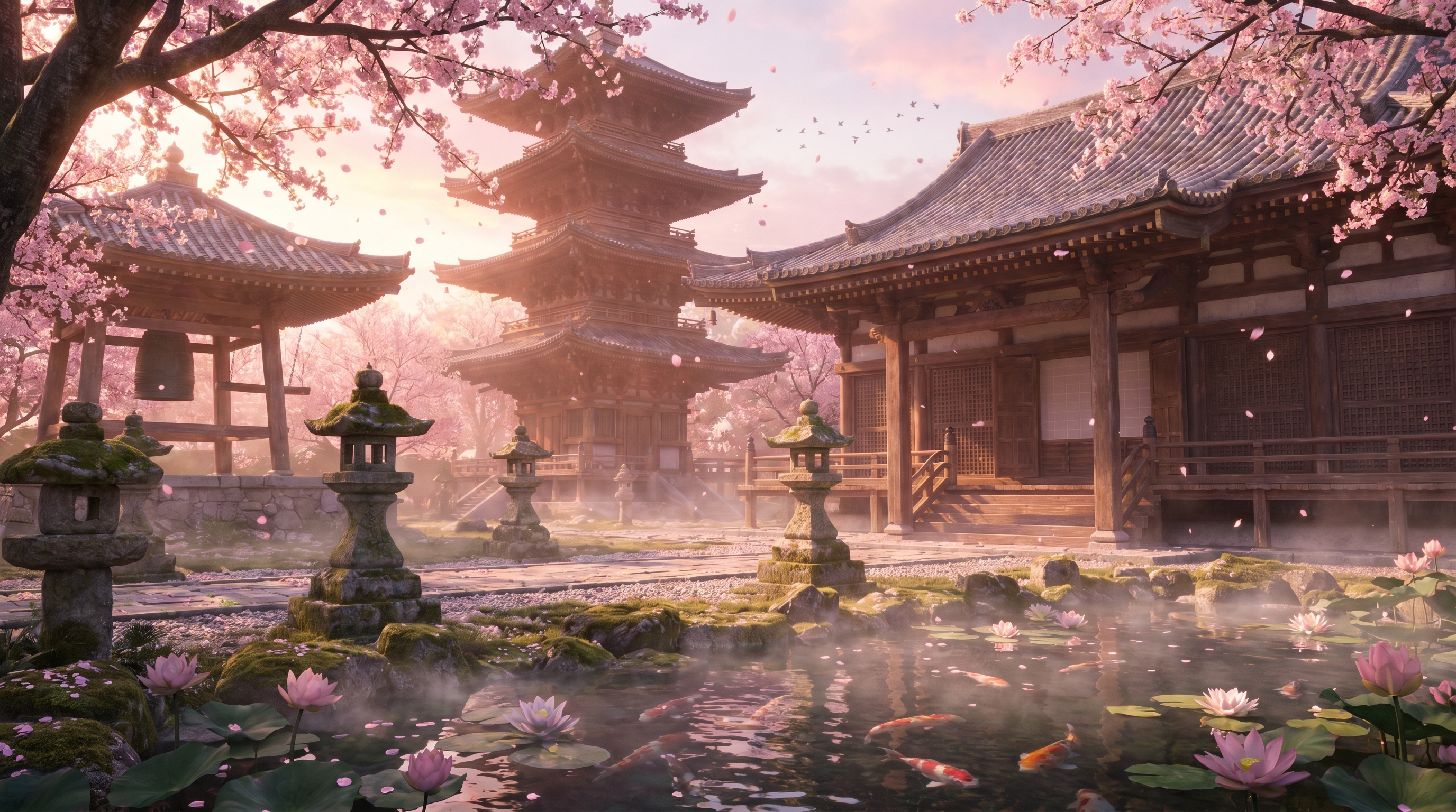 a koi pond. Warm pink and gold light. Distant temple bells and birdsong.