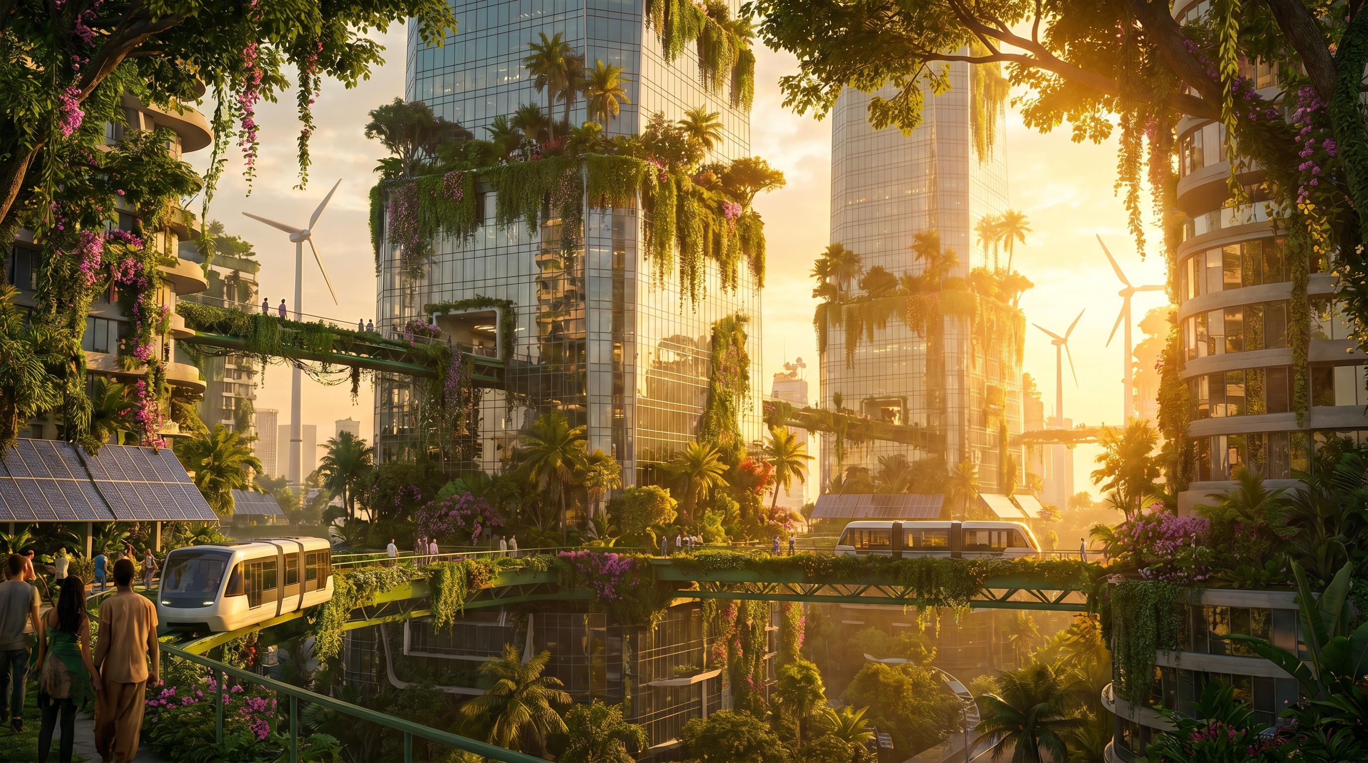 A solarpunk cityscape at golden hour. Massive glass skyscrapers draped